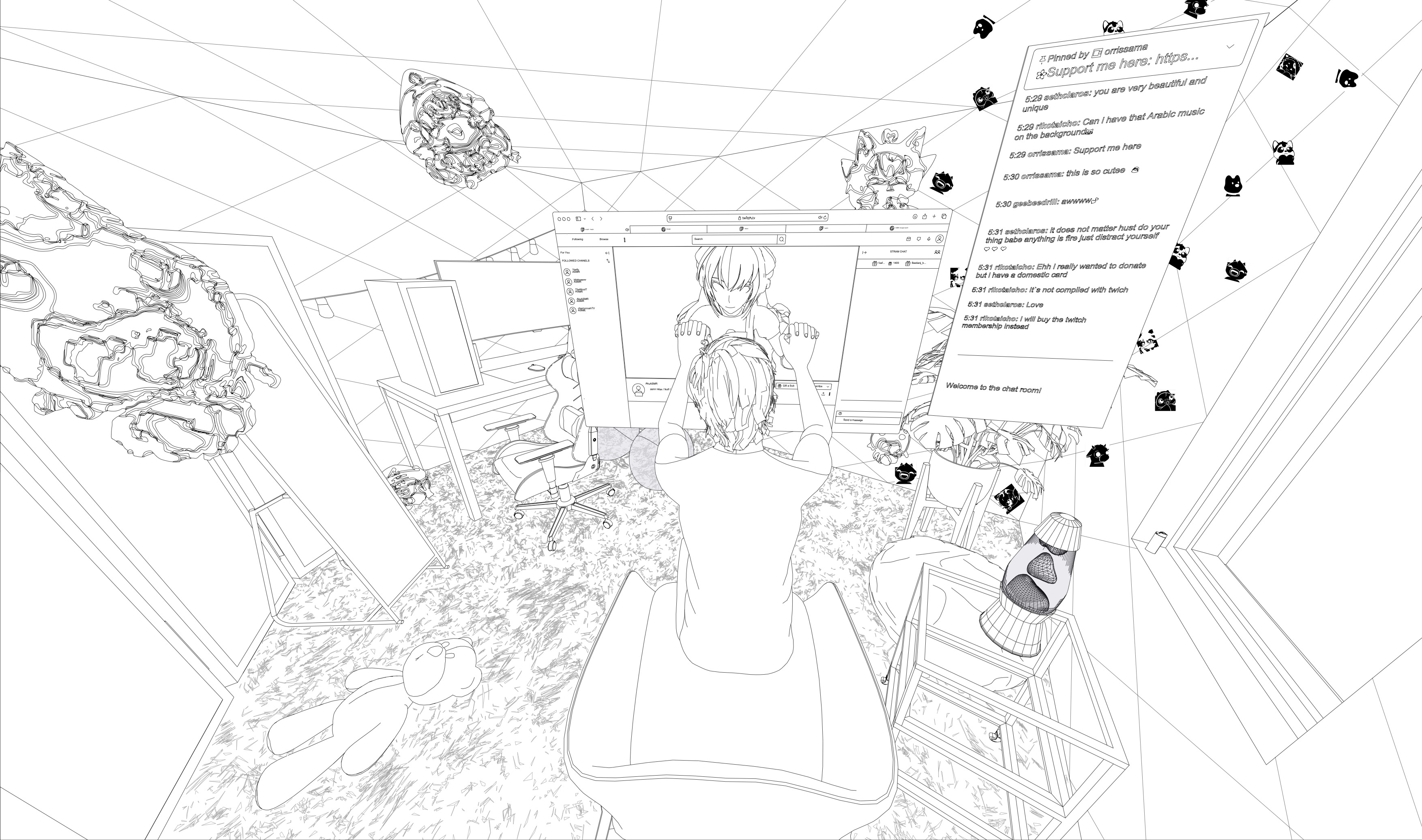 Platformness becomes a kind of new urban condition, where online platforms serve as gathering spaces built on clickbait, attention economies, and endless scrolling. Twitch, TikTok, and YouTube transform everyday routines into content, sparking new domestic economies. Cooking, gaming, dressing, talking to yourself—anything can be streamed. Personal space becomes content space.